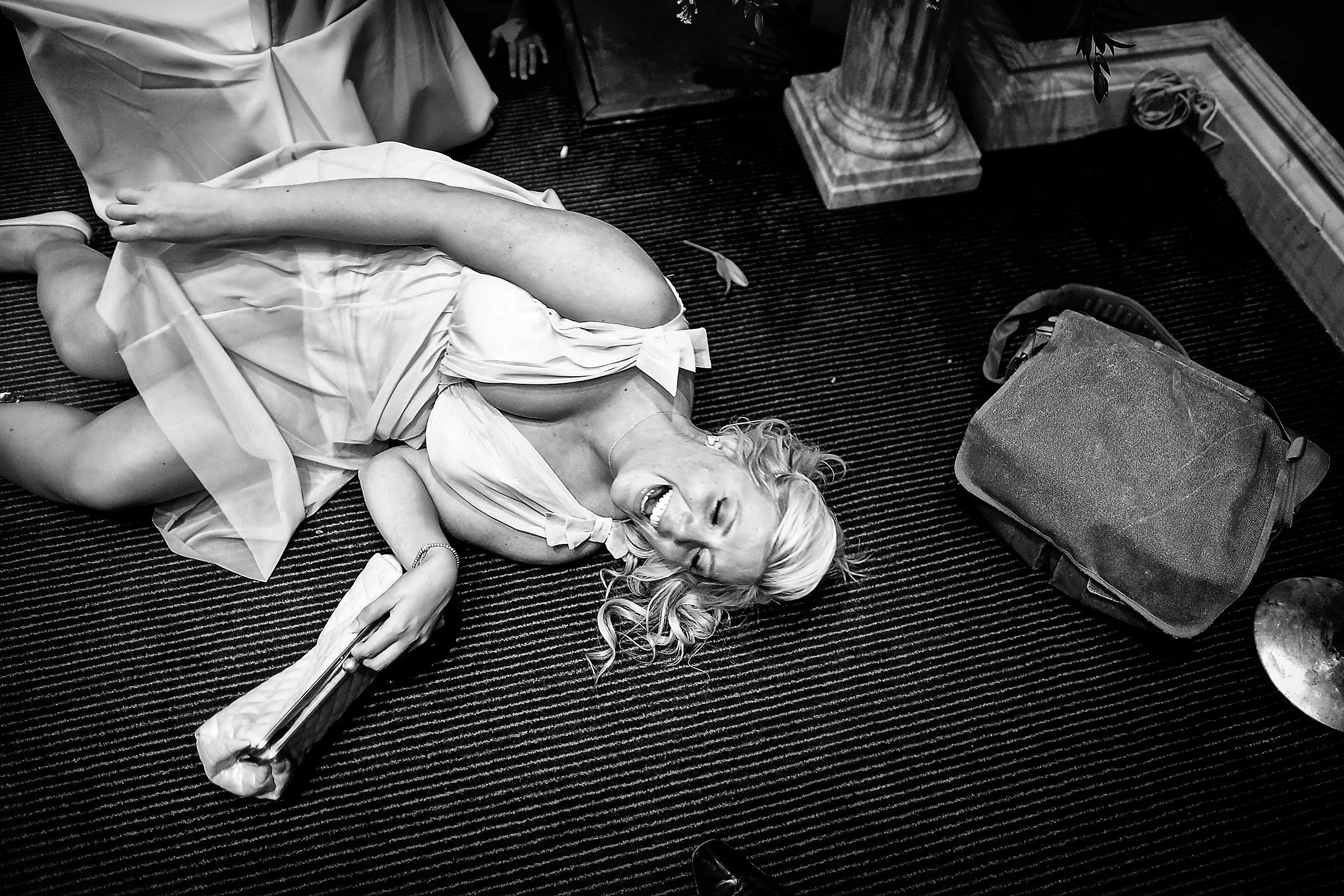 There is nothing necessarily gratifying about this composition if you were to look at it from a purely technical and literal standpoint, but there’s an energy I like, so as a snapshot, it works well. Post meal, this bridesmaid had just fallen from her chair laughing and I was reasonably close by, walking the room sporting a wide-angle lens. I tend to ‘patrol’ rooms post-wedding breakfast, as this sort of scene is not as unusual as you might imagine. I keep a wider-angle camera-lens combination in my hands as I wander so that it’s ready for these less composed snapshot moments. Self-critique: It’s quite a messy photograph in terms of clutter, which can be the nature of snapshots. There’s much room to the right, when had I included more frame to the left instead, I would have included the bridesmaid’s feet. Perhaps a tighter crop would have taken away my foot and the hand top frame from somebody else, though chaos does, I think, add to the energy.