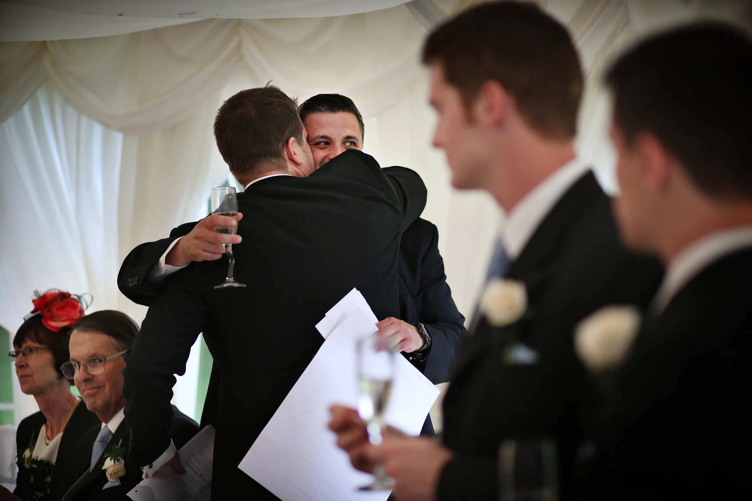 In photographic composition, layers refer to the different visual elements within an image that create depth, dimension, and interest. Layers can create more visually engaging photographs and, as in this case, add a depth that is more intriguing than simply a picture of the groom embracing a friend within a tight zoomed shot. You also open up your storytelling opportunities by introducing more characters or context to a photograph. There are six key people from this wedding in one picture; parents, a groom, his brother-in-law and the two best men. Self-critique: I try not to let important characters fall out of frame or be too close to edges where that could happen. Just a small step back or a slight shift of framing to the left would have prevented the mother of the groom from practically touching the left edge of this picture.