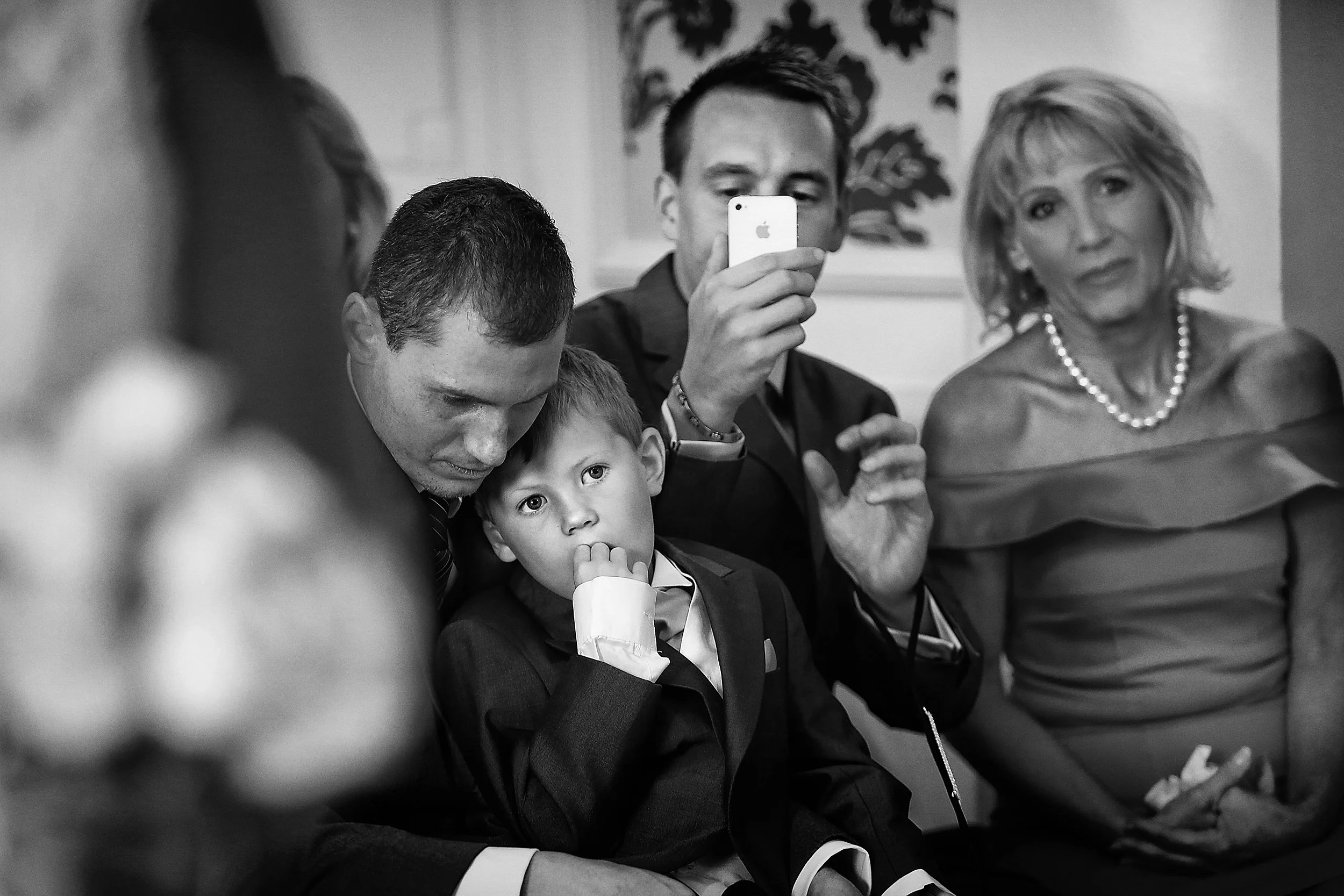 Look around the space you’re photographing. Isolate a scene and see how many characters within your frame can tell alternative stories to each other through their actions and interactions. Here, I see a father who appears to be enveloped by his own thoughts; his son, the page boy sitting on Dad’s lap, is looking toward the celebrant equally wistfully. A groomsman is busy filming the ceremony, and to the right, the bride’s mother seems equally visually trained on the celebrant as per the young lad. I’ve kept the very edge of the bride and groom to the left of the frame to give this composition a feeling of depth. Self-critique: I’m not overly fond of the head to the left of the frame, which appears slightly from behind the figure standing in the foreground. A slight shuffle to my left could have prevented this.